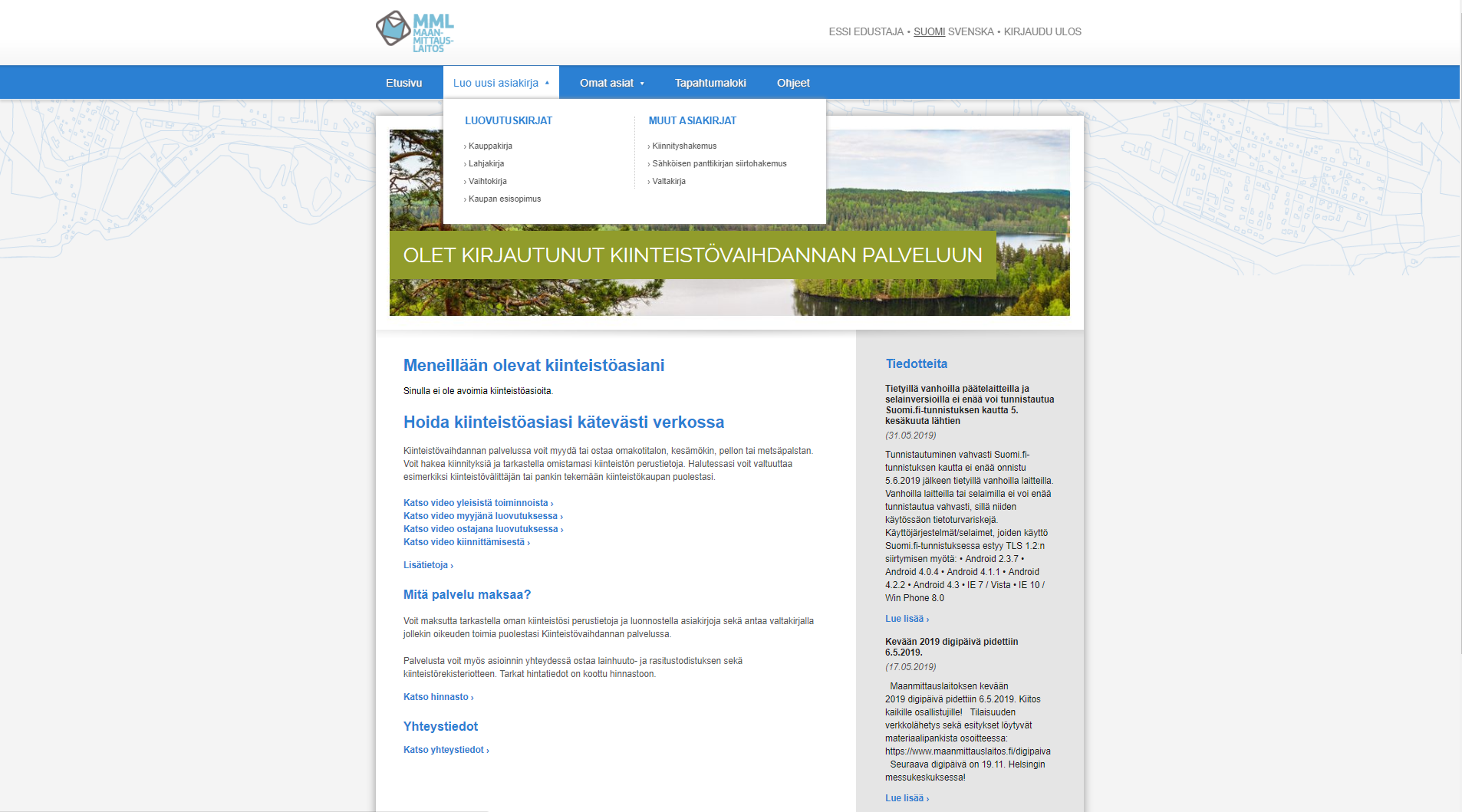 Kiinteistövaihdannan palvelu on kaikille avoin Maanmittauslaitoksen tarjoama verkkopalvelu. Voit tehdä lähes kaikki kiinteistöjen luovutukseen liittyvät sopimukset ja hakemukset sähköisesti vaikkapa omalta kotisohvaltasi!