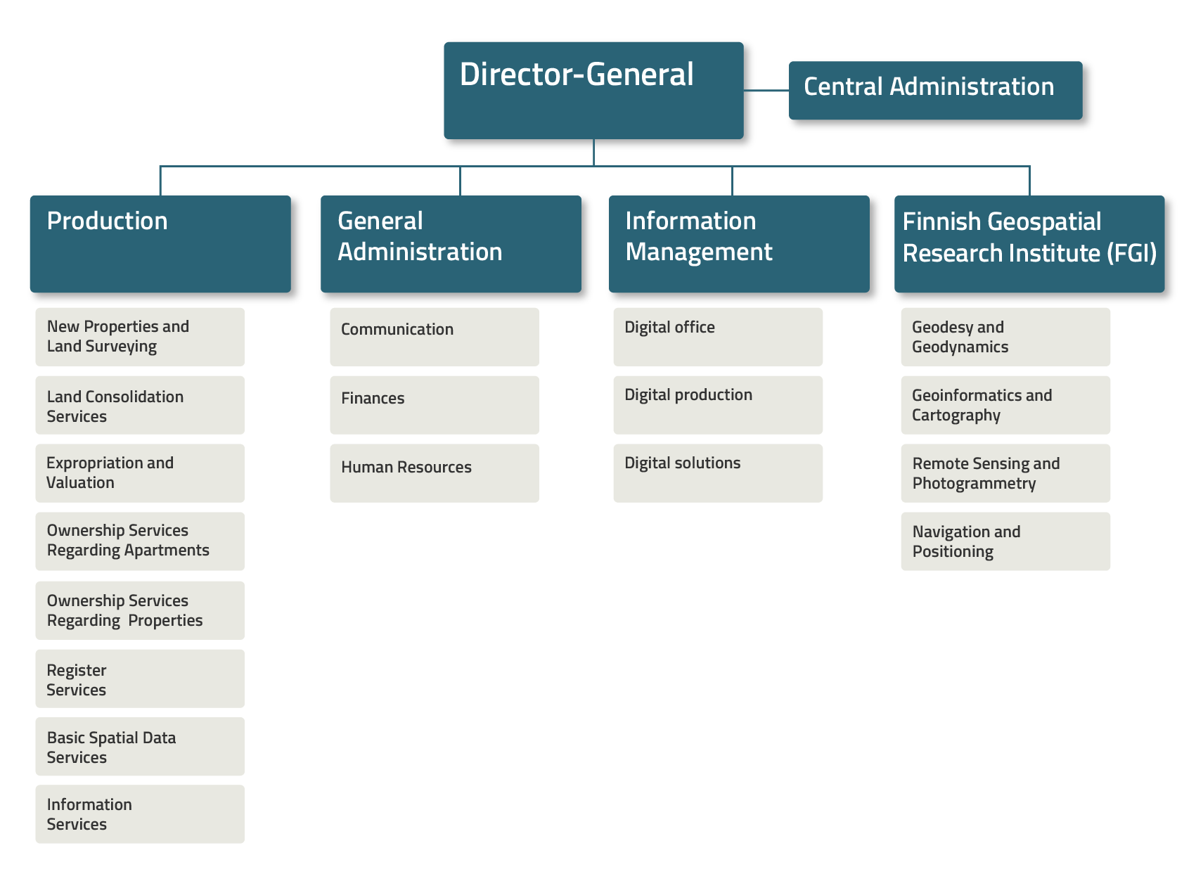 Director-General on the chart there are four operation units: Production, General Administration, Information Management and the Finnish Geospatial Research Institute (FGI). Below Production there are eight result units: New Properties and Land Surveying, Expropriation and Valuation, Land Consolidation Services, Ownership Services Regarding Apartments, Ownership Services Regarding Properties, Register Services, Basic Spatial Data Services, and Information Services.