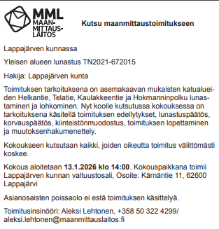 Kuulutus maanmittaustoimitukseen